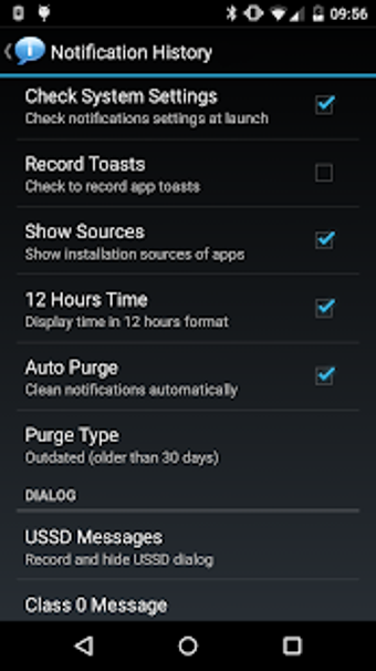 يوفر التطبيق العديد من الميزات المفيدة، بما في ذلك القدرة على حفظ الإشعارات في شريط الحالة، والتنبيهات، ورسائل USSD، ورسائل Class 0 (Flash SMS)، وجميع رسائل الحوار، وتاريخ تثبيت/تحديث/إلغاء تثبيت التطبيقات. يمكن للمستخدمين أيضًا تجميع الرسائل حسب التطبيقات وفرزها حسب الوقت. يقوم التطبيق حتى بحذف الإشعارات القديمة تلقائيًا لتقليل استهلاك الذاكرة ويتيح للمستخدمين إلغاء تثبيت التطبيقات مباشرةً.